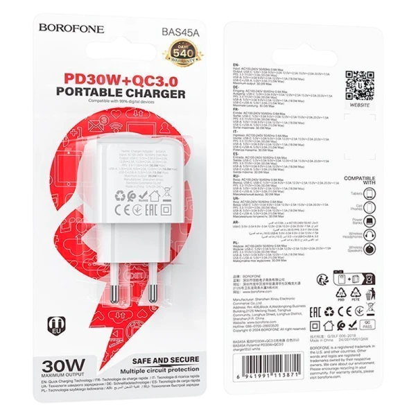 Сетевое З/У Borofone BAS45A Type-C 3.0A 30W QC3.0 белый (1/76/304)