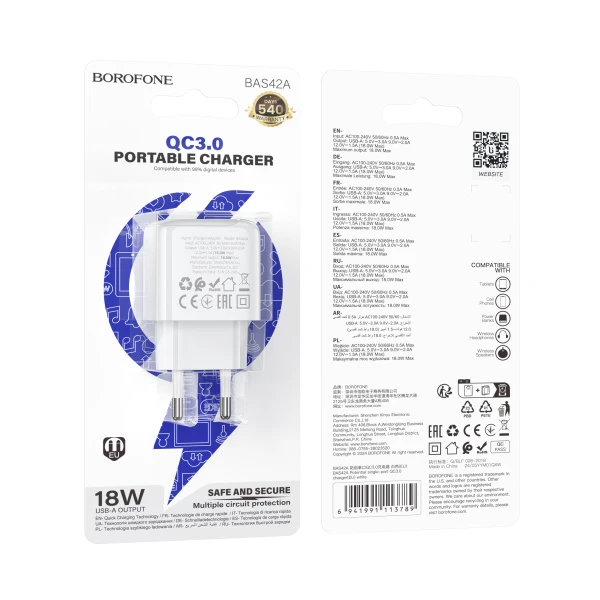 Сетевое З/У Borofone BAS42A 1USB 3.0A 18W QC3.0 белый (1/76/304)