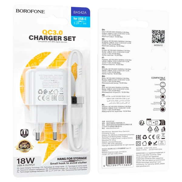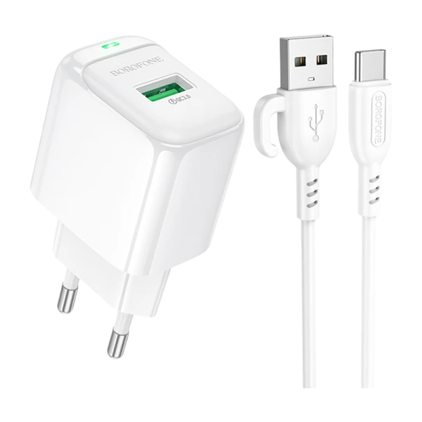 Borofone BAS42A, сетевое зарядное устройство с выходом USB 18W, вилка EU, поддержка протоколов быстрой зарядки. Кабель USB A(M) - USB C(M) (Type-C) в комплекте.