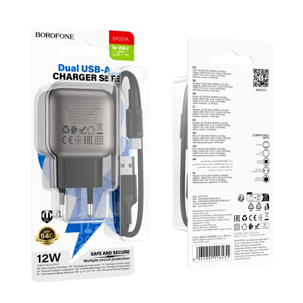 Сетевое З/У Borofone BAS51A 2USB 12W с кабелем Type-C черный (1/48/192)