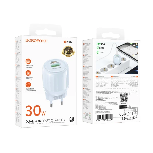 Сетевое З/У Borofone BA94A 1USB+1Type-C 3.0A 30W PD,QC синий (1/30/120)