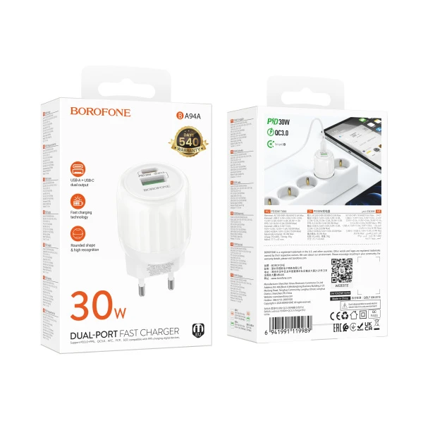 Сетевое З/У Borofone BA93A 1USB+1Type-C 3.0A 20W PD,QC белый (1/30/120)