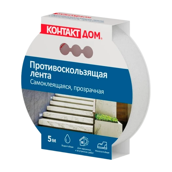 Лента противоскользящая Контакт Дом клейкая прозрачная, 25 мм(5 м) применяется для предотвращения скольжения как в жилых, так и нежилых помещениях: офисах, торговых центрах, общественных учреждениях и пр. Подходит для использования на ступенях лестниц, вокруг бассейнов, а так же других местах с повышенной влажностью.