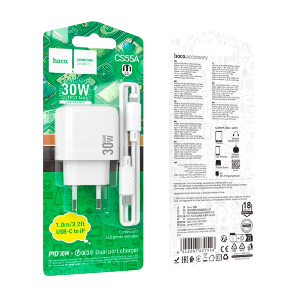 Сетевое З/У HOCO CS55A 1USB+1Type-C 3.0A 30W QC3.0 с кабелем Type-C-Lightning белый.