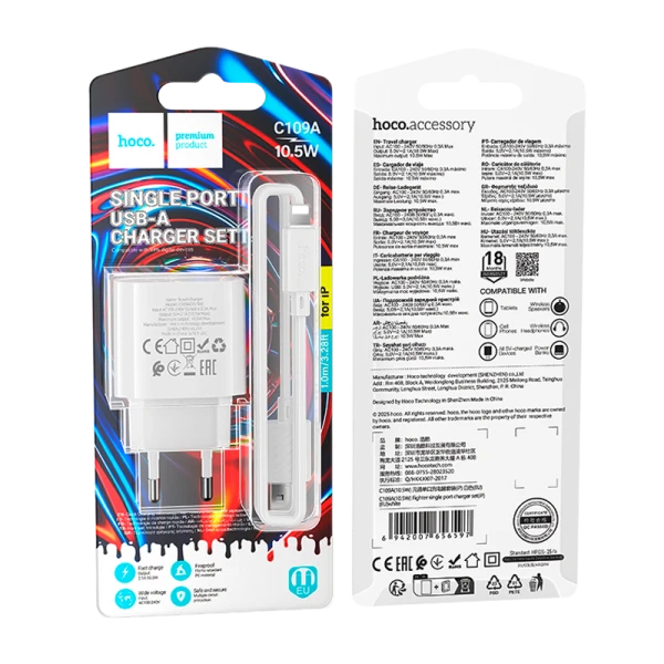 Сетевое З/У HOCO C109A 1USB 10.5W с кабелем Lightning белый.