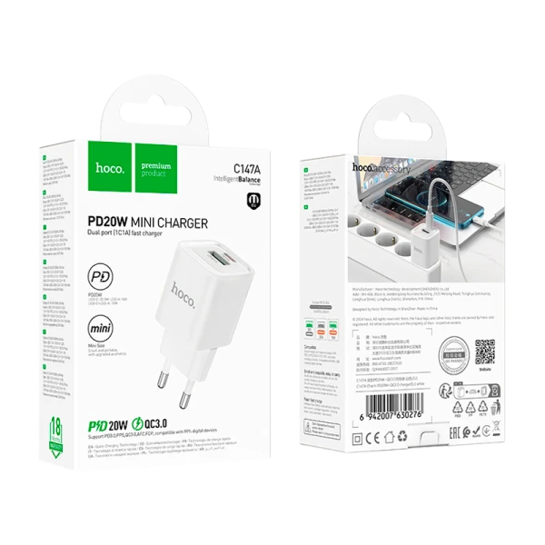 Сетевое З/У HOCO C147A 1USB+1Type-C 3.0A 20W PD,QC белый (1/30/180)