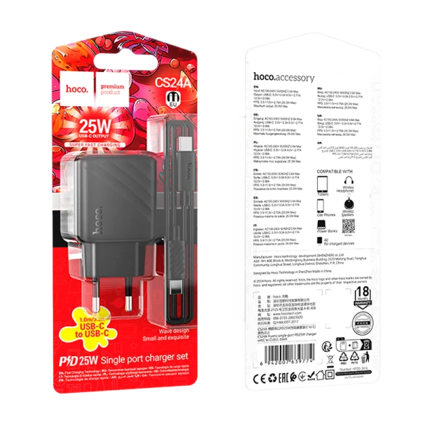 Сетевое З/У HOCO CS24A Type-C 25W PD3.0 с кабелем Type-C черный (1/24/144)