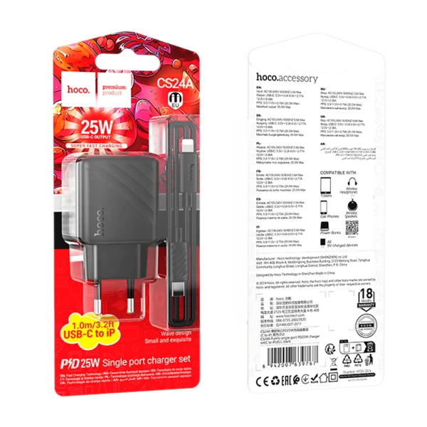 Сетевое З/У HOCO CS24A Type-C 25W PD3.0 с кабелем Lightning черный (1/24/144)