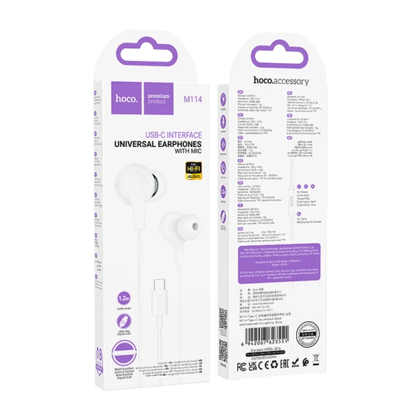 Наушники внутриканальные HOCO M114 с микр. Type-C белый (1/31/310)