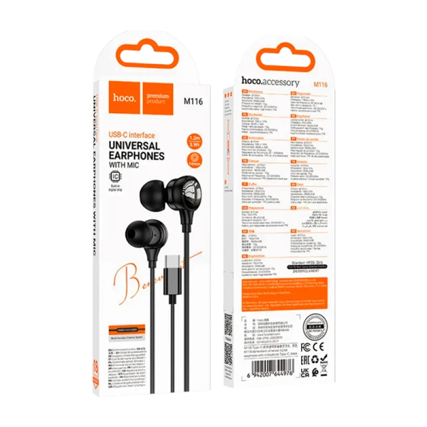 Наушники внутриканальные HOCO M116 с микрофоном, Type-C черный.