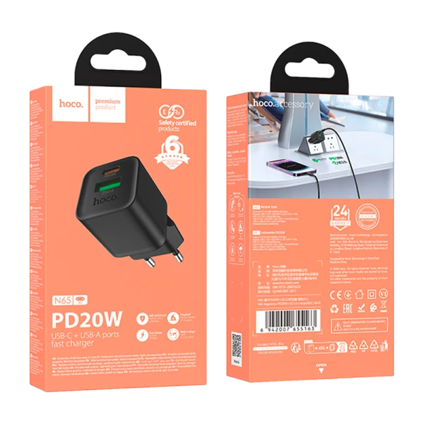 Сетевое З/У HOCO N65 1USB+1Type-C 20W PD,QC черный (1/13/130)