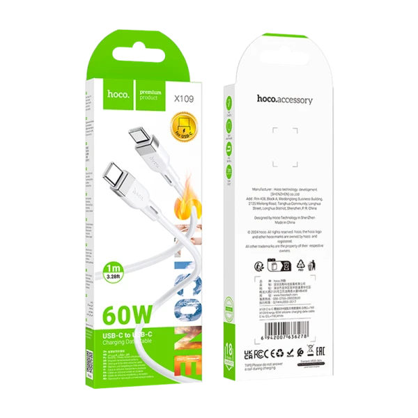 Кабель HOCO X109 Type-C (m)-Type-C (m) 1м 3.0A 60W силикон белый.