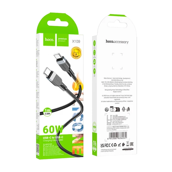 Кабель HOCO X109 Type-C (m)-Type-C (m) 1м 3.0A 60W силикон черный.