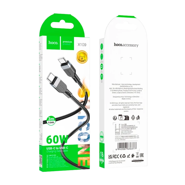 Кабель HOCO X109 Type-C (m)-Type-C (m) 3м 3.0A 60W силикон черный.