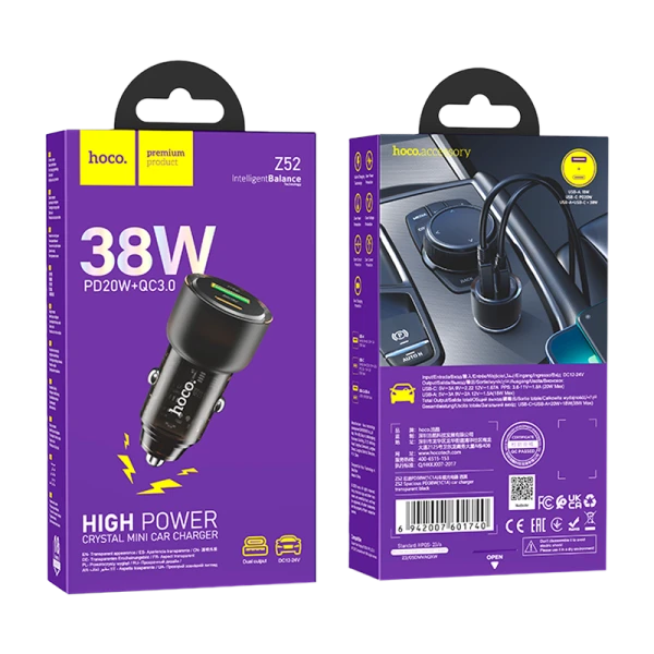 Автомобильное З/У HOCO Z52 1USB/Type-C 3.0A 38W QC3.0 черный (1/12/120)