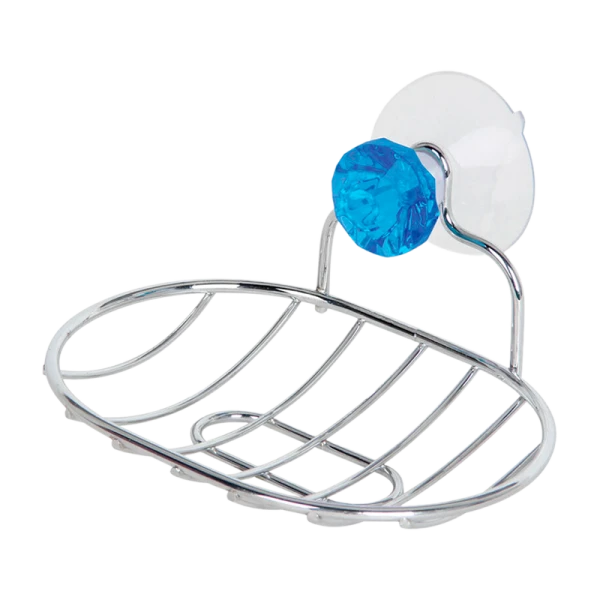 Мыльница-решетка овальная выполнена из хромированного металла, который надежно защищен от коррозии. Изделие крепится к стене с помощью декоративной присоски с имитацией бриллианта синего цвета (входит в комплект).