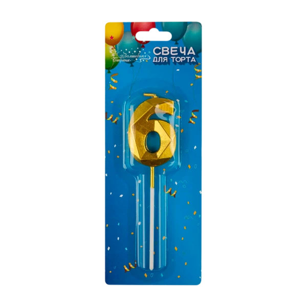 Декоративная свеча Волшебная страна, цифра 6 золотого цвета отлично подойдет для украшения праздничного торта или другого десерта.