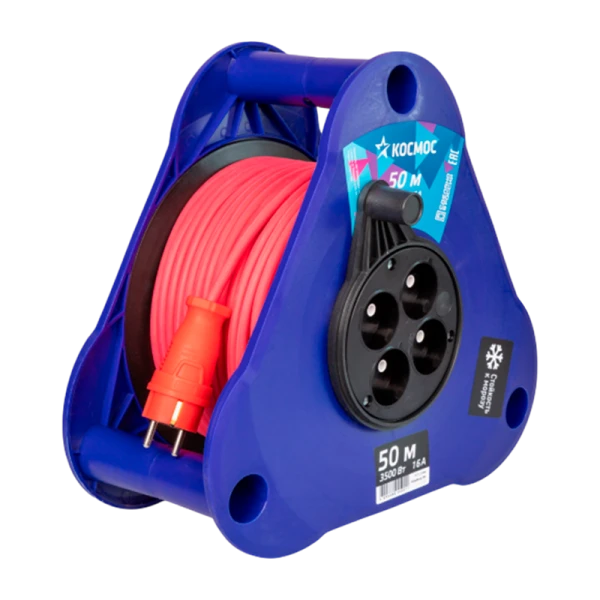 Удлинитель на катушке 50 метров на 4 гнезда. Новая катушка треугольной формы. Катушка выполнена из толстого и прочного пластика, благодаря чему, удлинитель обладает выдающимися характеристиками, а новая треугольная форма увеличивает практичность и функциональность. Кабель КГ-ХЛ морозостойкий 2х2,5мм (без заземления). Максимальная мощность подключения 3500 Вт (16А) благодаря сечению провода 2,5 мм. Удлинители 16А подойдут для мощного прибора или инструмента, либо для одновременной работы нескольких инструментов средней мощности, а провод КГ позволит использовать удлинитель даже в самый сильный мороз.