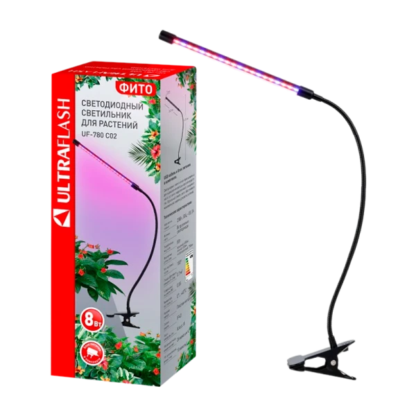 Светодиодный фито светильник Ultraflash UF-780 C02 (8Вт) предназначен для выращивания рассады и досветки растений при недостаточном освещении. Идеальная гибкая шея, поворот на 360 градусов, в комплекте USB кабель и блок питания.