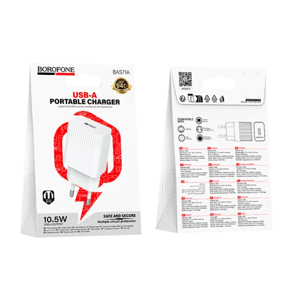 Сетевое З/У Borofone BAS71A 1USB 2.4A 10.5W белый (1/20/120)