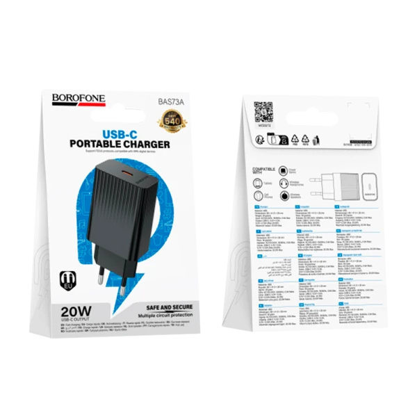Borofone BAS73A - стильное сетевое зарядное устройство с выходом Type-C 20 Вт, вилкой EU и поддержкой протоколов быстрой зарядки QC 3.0 и PD 20W.