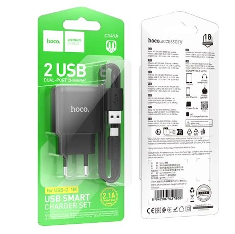 Блок питания сетевой 2 USB HOCO C141A Smart, 2100mA, пластик, кабель USB - Type-C, цвет: чёрный