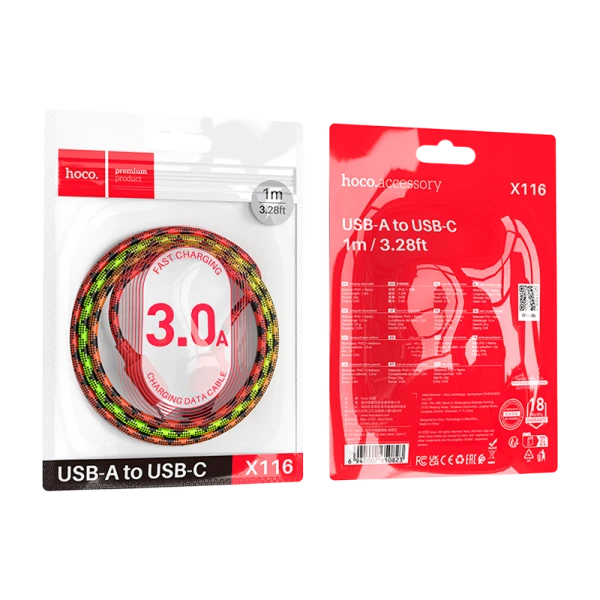 Кабель HOCO X116 USB (m)-Type-C (m) 1м 3.0A нейлон красный (1/68/680)