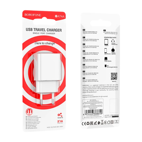 Сетевое З/У Borofone BA74A 1USB 2.1A белый (1/78/312)