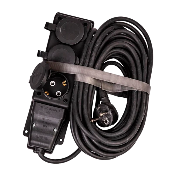 Силовой удлинитель-колодка КОСМОС. Удлинитель имеет прочный, маслобензостойкий провод КГ, который не боиться морозов и тяжелых условий экспуатации, а так же каучуковую колодку с тремя гнездами защищенную по стандарту IP44. Данный удлинитель выдержит до 4000Вт нагрузки и подойдет даже для самых требовательных инструментов и приборов. Отличный выбор для домашнего использования и надежный варинат для ремонтных работ в любую погоду. Длина провода 10 метров, 16А. Цвет черный.