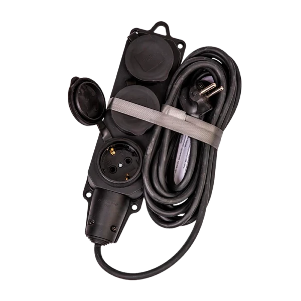 Силовой удлинитель-колодка КОСМОС. Удлинитель имеет прочный, маслобензостойкий провод КГ, который не боится морозов и тяжелых условий экспуатации, а так же каучуковую колодку с тремя гнездами защищенную по стандарту IP44. Данный удлинитель выдержит до 4000Вт нагрузки и подойдет даже для самых требовательных инструментов и приборов. Отличный выбор для домашнего использования и надежный варинат для ремонтных работ в любую погоду. Длина провода 5 метров, 16А. Цвет черный.