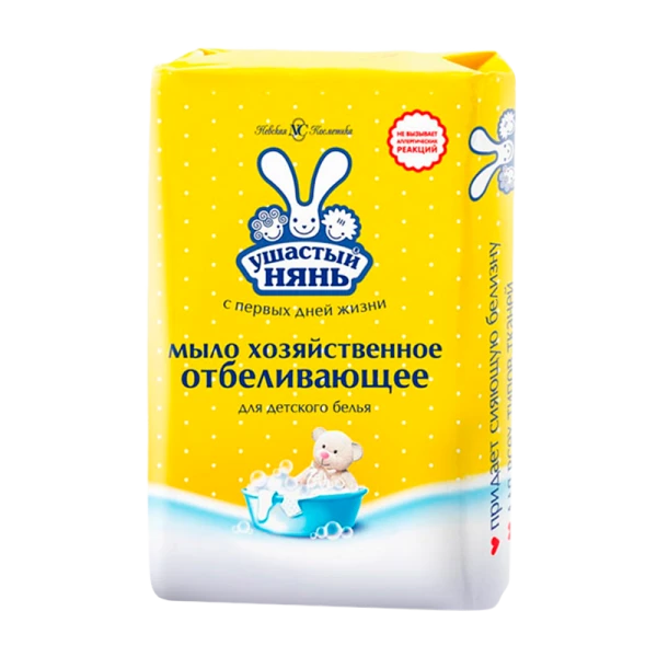 Гипоаллергенное хозяйственное мыло "Ушастый нянь" специально предназначено для стирки детского белья и подходит для всех типов тканей. Поддерживает эффект белизны на ткани при повторных стирках. С отбеливающим эффектом. Предназначена специально для стирки детских вещей. Придает белью сияющую белизну и свежесть. Содержит кондиционирующую добавку.