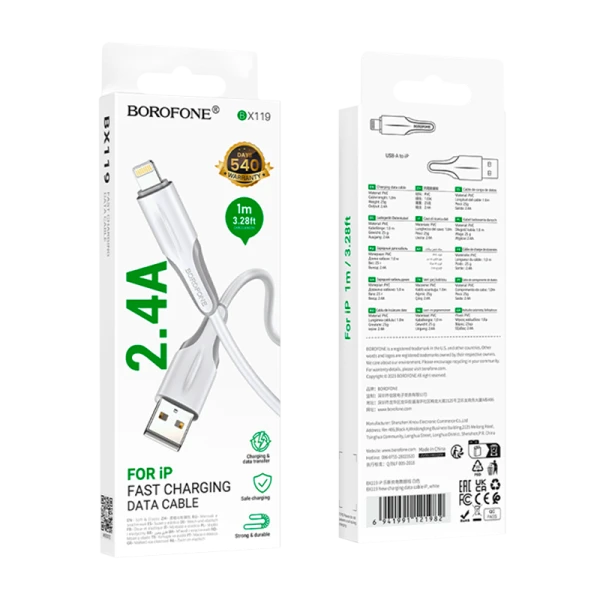 Кабель Borofone BX119 USB (m)-Lightning (m) 1м 2.4A ПВХ белый (1/360)