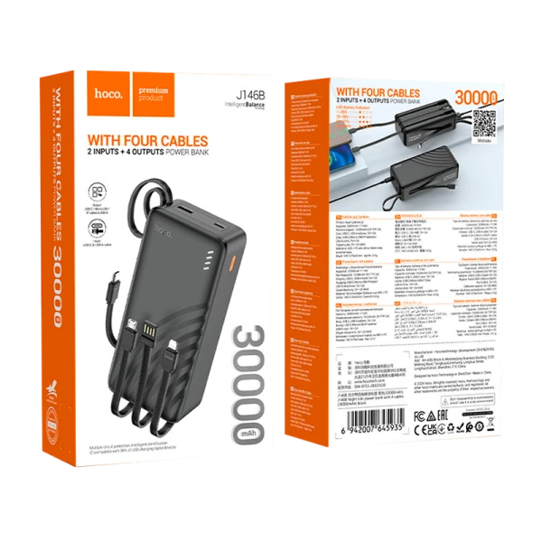 Внешний аккумулятор HOCO J146B 30000mAh 2.0A 1USB+1Type-C с кабелем Type-C черный (1/24)