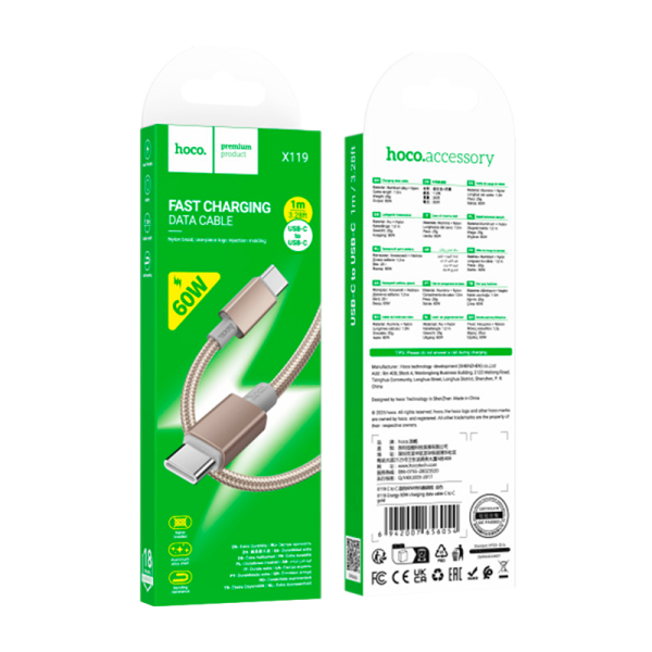 Кабель HOCO X119 Type-C (m)-Type-C (m) 1м 3.0A 60W нейлон PD3.0 золотой (1/420)