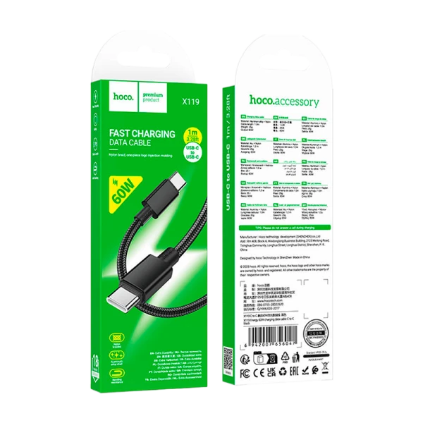 Кабель HOCO X119 Type-C (m)-Type-C (m) 1м 3.0A 60W нейлон PD3.0 черный (1/420)