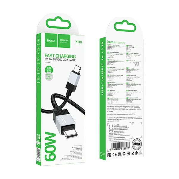 Кабель HOCO X110 Type-C (m)-Type-C (m) 1м 3.0A 60W нейлон черный.