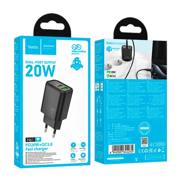 Сетевое З/У HOCO N61 1USB+1Type-C 20W PD,QC черный (1/12/120)