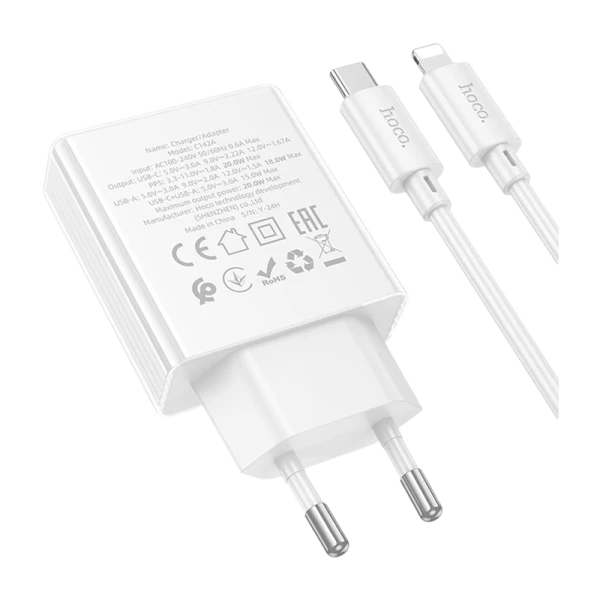 Сетевое З/У HOCO C142A 1USB+1Type-C 20W PD,QC с кабелем Type-C-Lightning голубой (1/19/190)