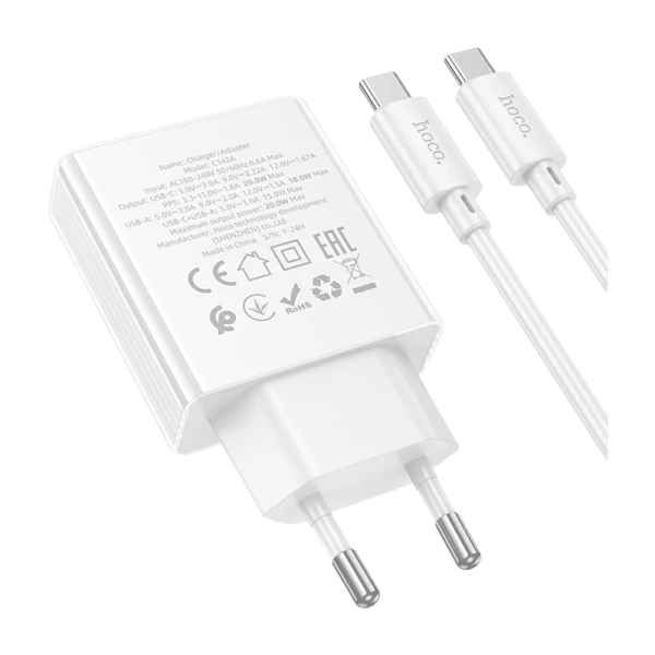 Сетевое З/У HOCO C142A 1USB+1Type-C 20W PD,QC с кабелем Type-C/Type-C голубой.