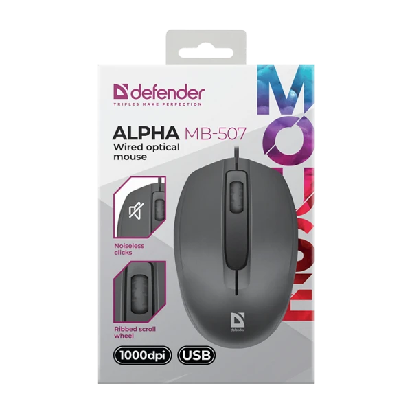 Мышь проводная Defender MB-507 Alpha классическая USB бесшумная, черный цвет. Оптимальное разрешение 1000 dpi (разрешение 1000 dpi является оптимальным при работе с экранами 9-22"). Бесшумное нажатие кнопок. Тихие левая и правая кнопки. Рифленое колесо прокрутки. Симметричная обтекаемая форма удобна для работы любой рукой. Тонкий и гибкий кабель отличается прочностью и надежностью.