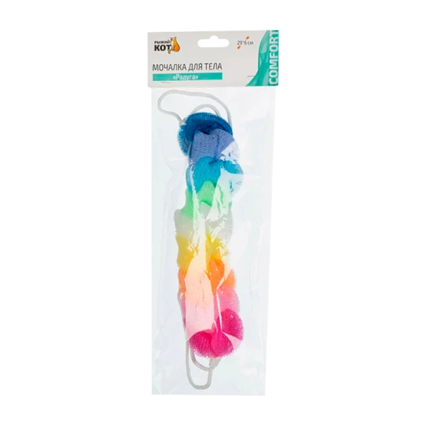 Мочалка для тела Рыжий кот Радуга подходит для ежедневного использования. Она деликатно очищает и отшелушивает кожу. Благодаря пористой структуре моющие средства обильно пенятся даже в небольшом количестве. Изделие не требует специального ухода, легко промывается проточной водой и быстро сохнет.
