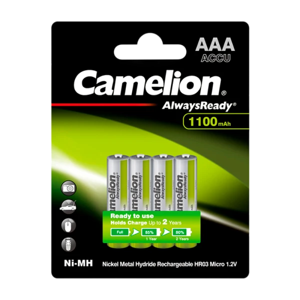 Аккумуляторы предзаряженные Camelion, которые совмещают в себе плюсы батарейки и аккумулятора. Они готовы к использованию сразу после покупки и практически не разряжаются в течение длительного срока хранения (не более 15% в год от первоначальной емкости). Подходят к устройствам с различным энергопотреблением и являются прекрасной заменой обычным батарейкам. Покупая аккумуляторы Always Ready, вы экономите на стоимости 1000 алкалиновых батареек и защищаете окружающую среду от токсичных отходов!