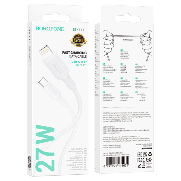 Кабель Borofone BX111 Type-C (m)-Lightning (m) 1м 3.0A 27W ПВХ PD3.0 белый (1/360)