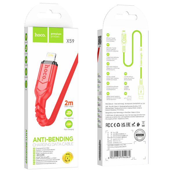 Кабель HOCO X59 USB (m)-Lightning (m) 2м 2.4A нейлон красный (1/33/330)