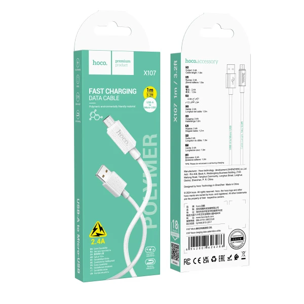 Кабель HOCO X107 USB (m)-microUSB (m) 1м 2.4A ПВХ белый (1/31/310)