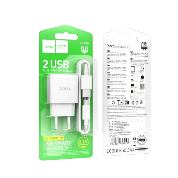 Сетевое З/У HOCO C141A 2USB 2.1A с кабелем Type-C белый (1/28/168)