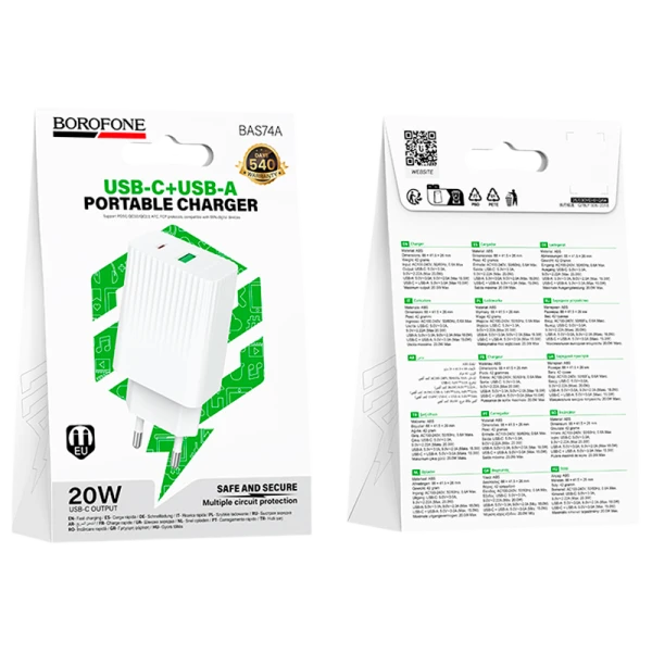 Сетевое З/У Borofone BAS74A 1USB+1Type-C 20W PD3.0 белый (1/20/120)