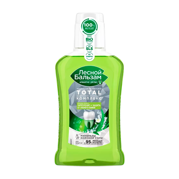 Ополаскиватель Лесной бальзам TOTAL Комплекс с морской солью, соком алоэ и экстрактом белого чая. Формула ополаскивателя на 98% состоит из ингредиентов натурального происхождения, интенсивно очищает зубы от налета, защищает от зубного камня и препятствует развитию кровоточивости десен, обеспечивая комплексную защиту всей полости рта.Формула ополаскивателя TOTAL Комплекс борется с первопричиной развития серьезных проблем полости рта – зубным налетом, который вызывает кариес, влияет на изменение цвета зубов, приводит к образованию зубного камня и кровоточивости десен.
