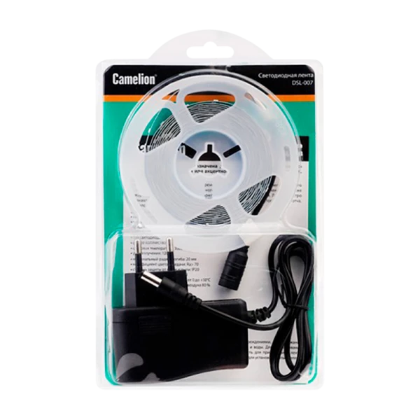 Светодиодная лента Camelion DSL-007 длиной 3 метра имеет степень защиты IP20 и цветность 3000K. Лента оснащена светодиодами типа 2835-60D, мощностью 15 Вт. В комплекте идет контроллер и блок питания. Обеспечивает надежную защиту от пыли и воды.