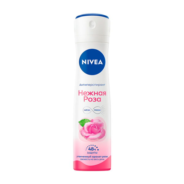 Дезодорант-антиперспирант «Нежная роза» от Nivea. Попробуйте ноты свежих бутонов роз и ощутите благородную цветочную композицию на целый день! Дарит чувственный аромат алой розы, который останется с Вами дольше, чем просто на пару часов. Защищает кожу подмышек от неприятного запаха в течение 48 часов*. Антибактериальный эффект не только маскирует неприятный запах, но и активно борется с бактериями. Не содержит этилового спирта.